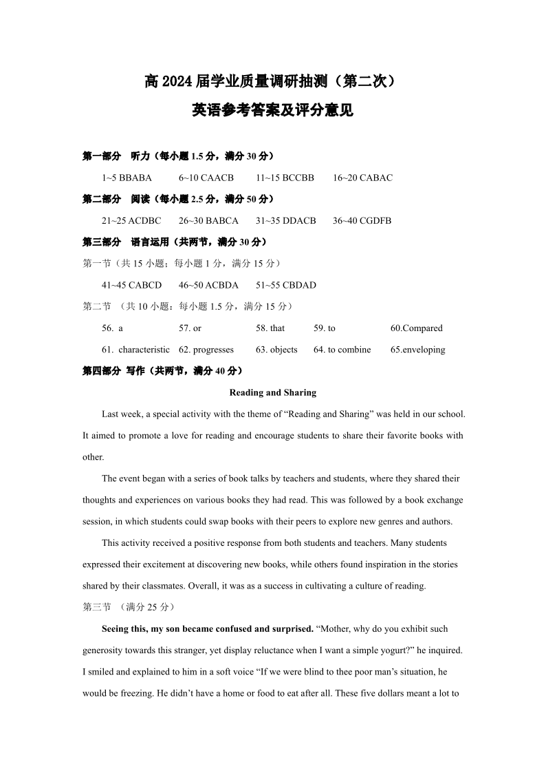 重庆市主城九龙坡区高2024届学业质量调研抽测(第二次)英语答案