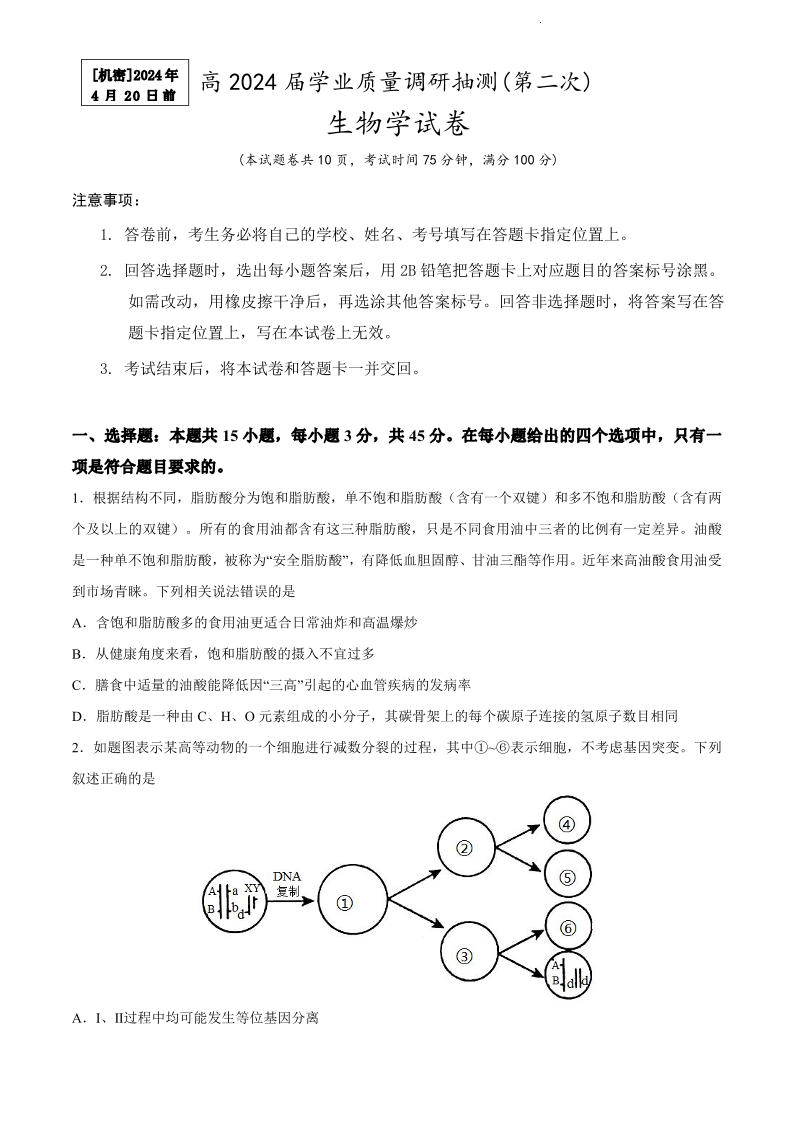 重庆市主城九龙坡区高2024届学业质量调研抽测(第二次)生物