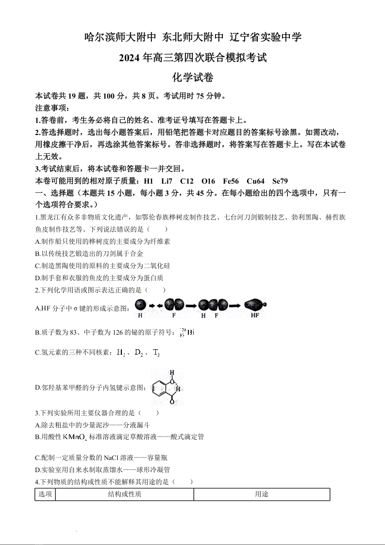 东北三省三所百强校2024届高三下学期第四次联合模拟考化学