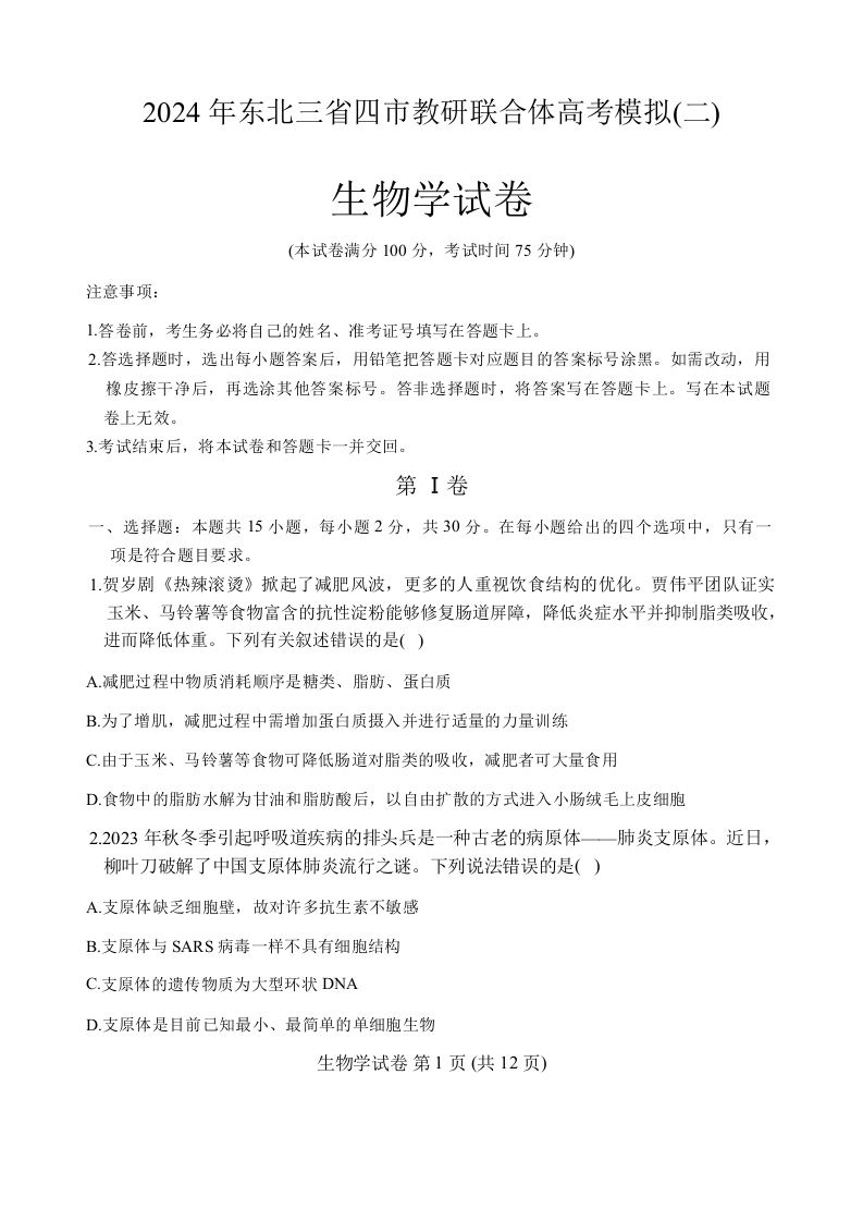 东北三省四市教研联合体2024届高三下学期二模考试生物