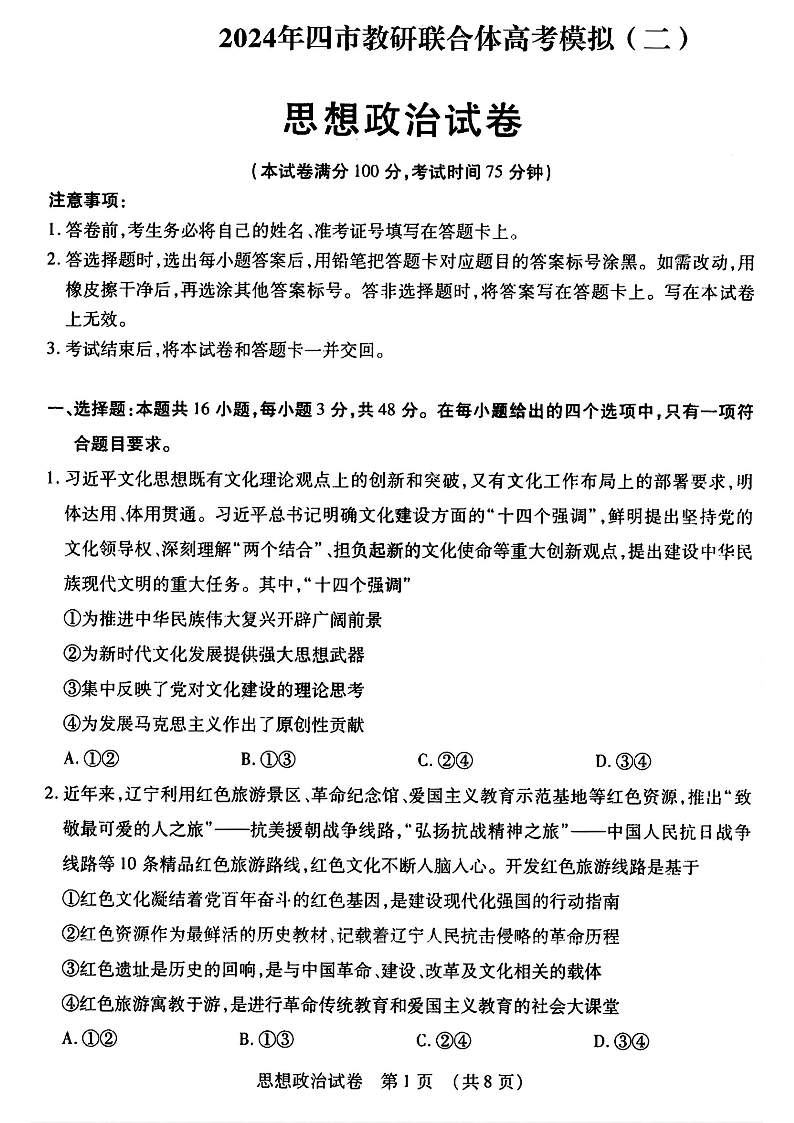 东北三省四市教研联合体2024届高三下学期二模考试政治