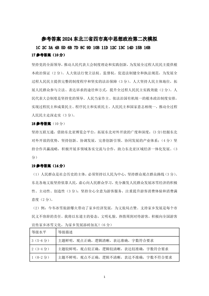 东北三省四市教研联合体2024届高三下学期二模考试政治答案