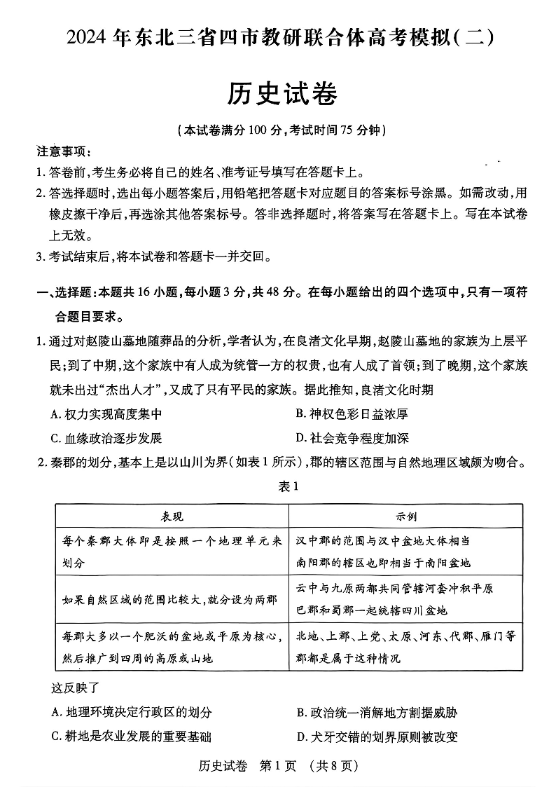 东北三省四市教研联合体2024届高三下学期二模考试历史