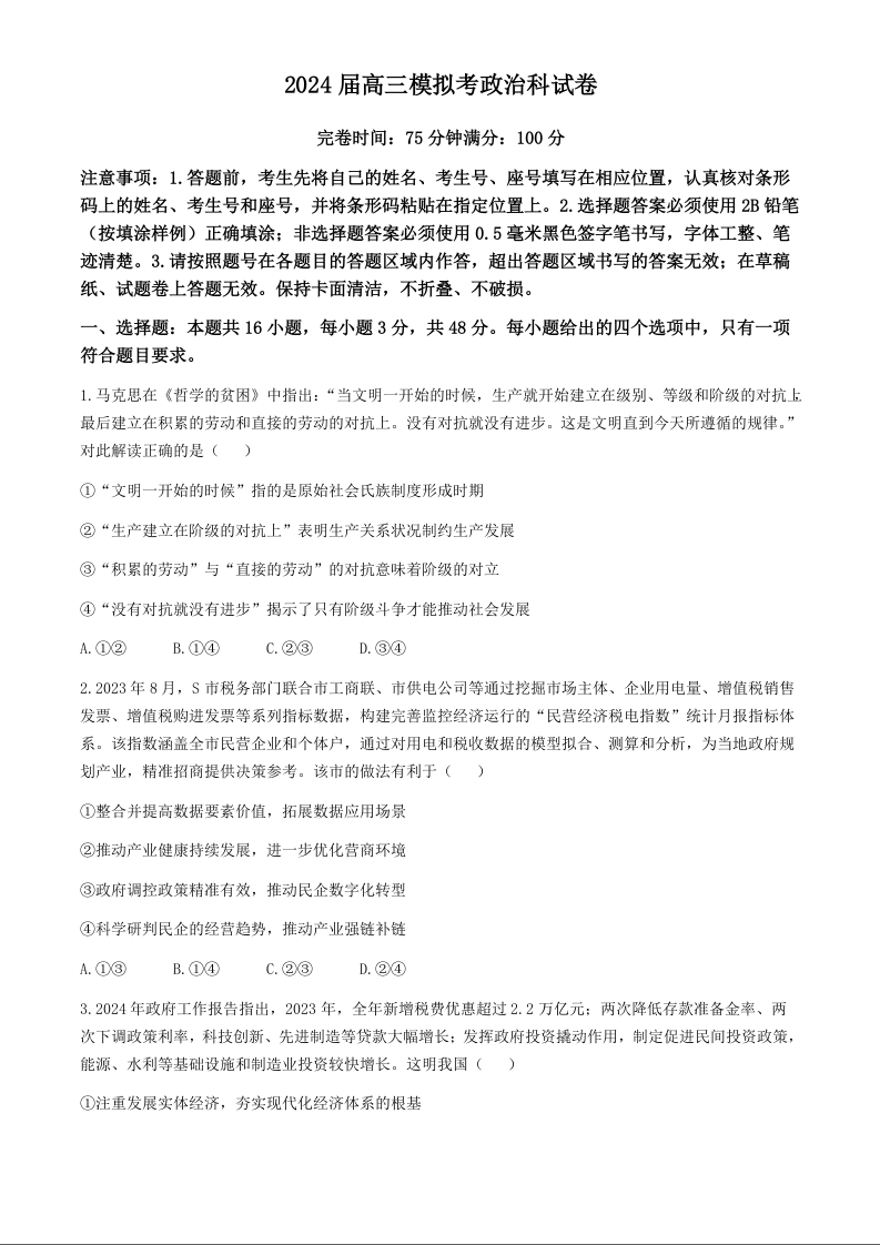 福建省福州市八县市一中2024届高三下学期5月模拟考政治+答案