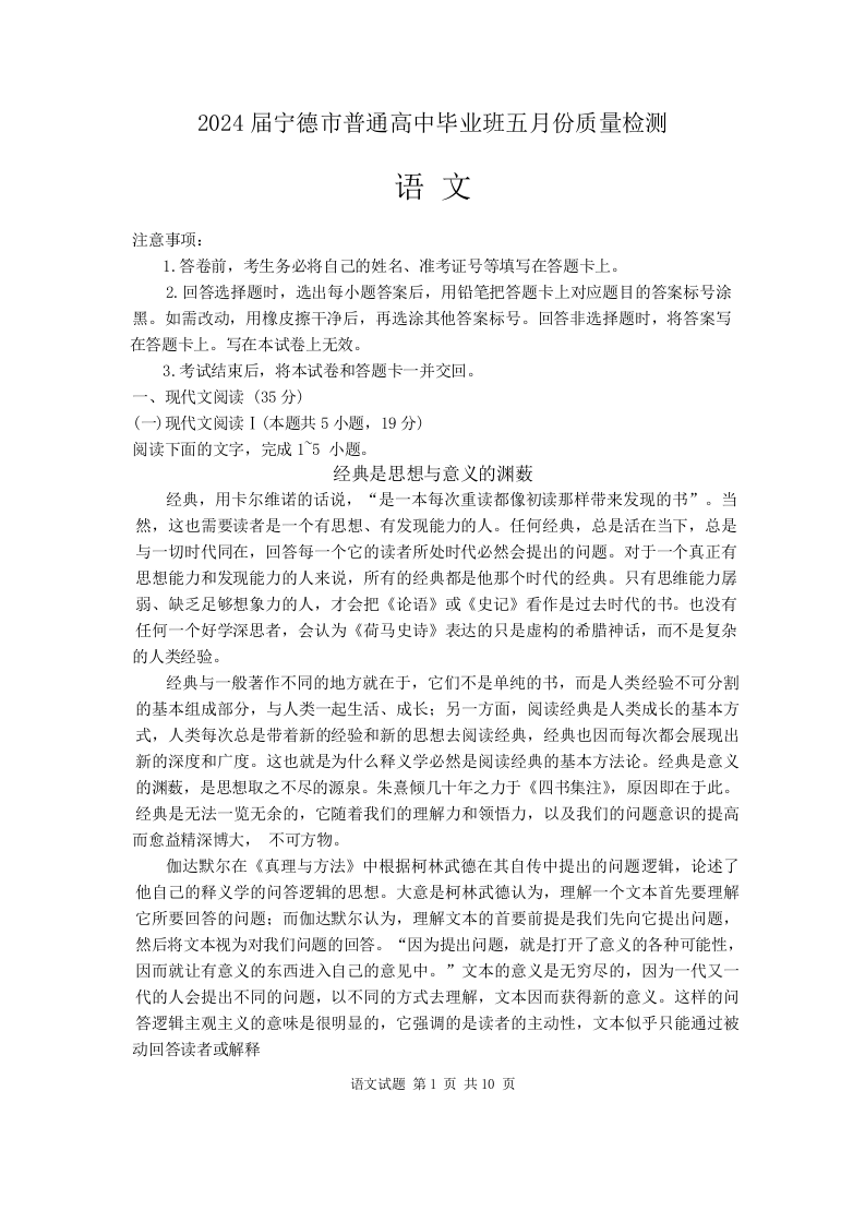 福建省宁德市2024届高三下学期5月质量检测(三模)语文+答案