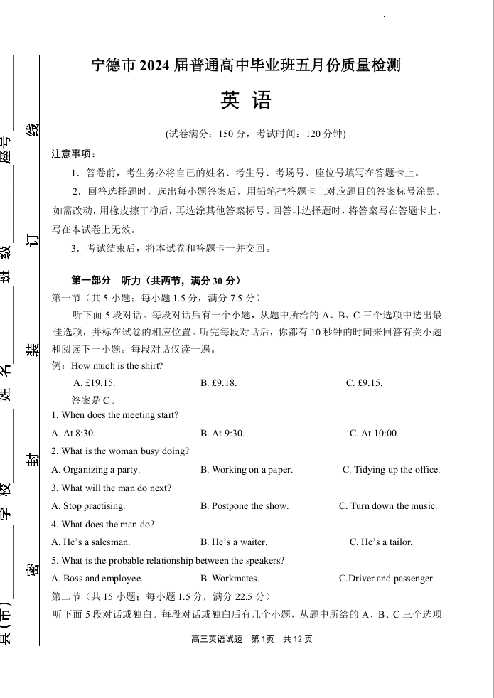 福建省宁德市2024届高三下学期5月质量检测(三模)英语