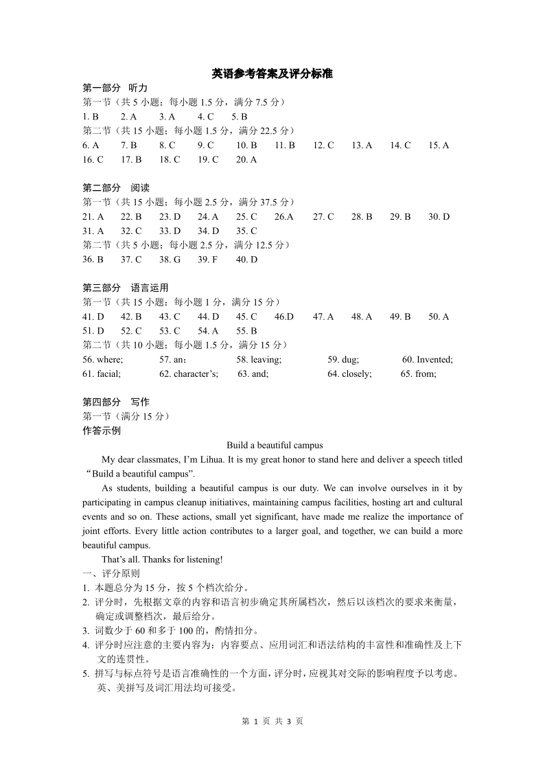福建省宁德市2024届高三下学期5月质量检测(三模)英语答案
