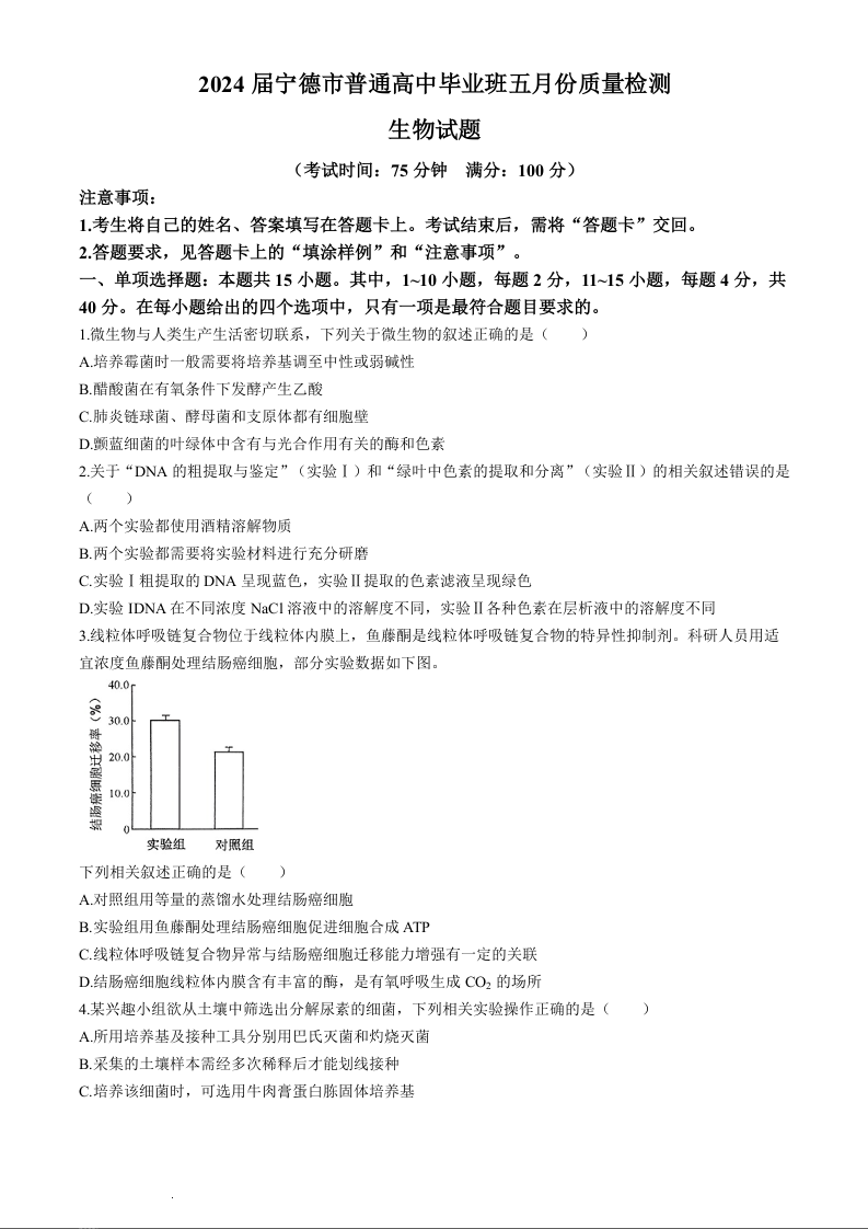 福建省宁德市2024届高三下学期5月质量检测(三模)生物+答案