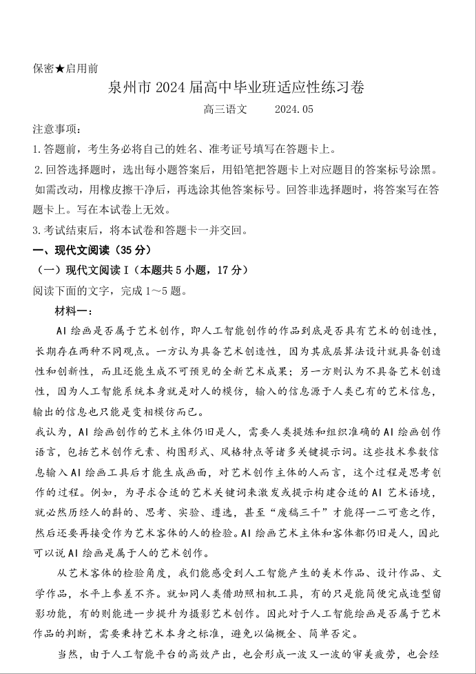 福建省泉州市2024届高三质量检测(五)语文+答案