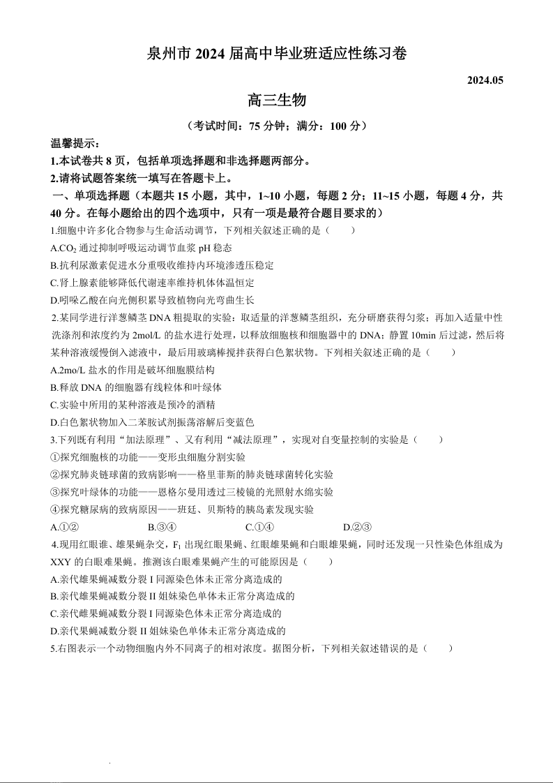 福建省泉州市2024届高三质量检测(五)生物+答案