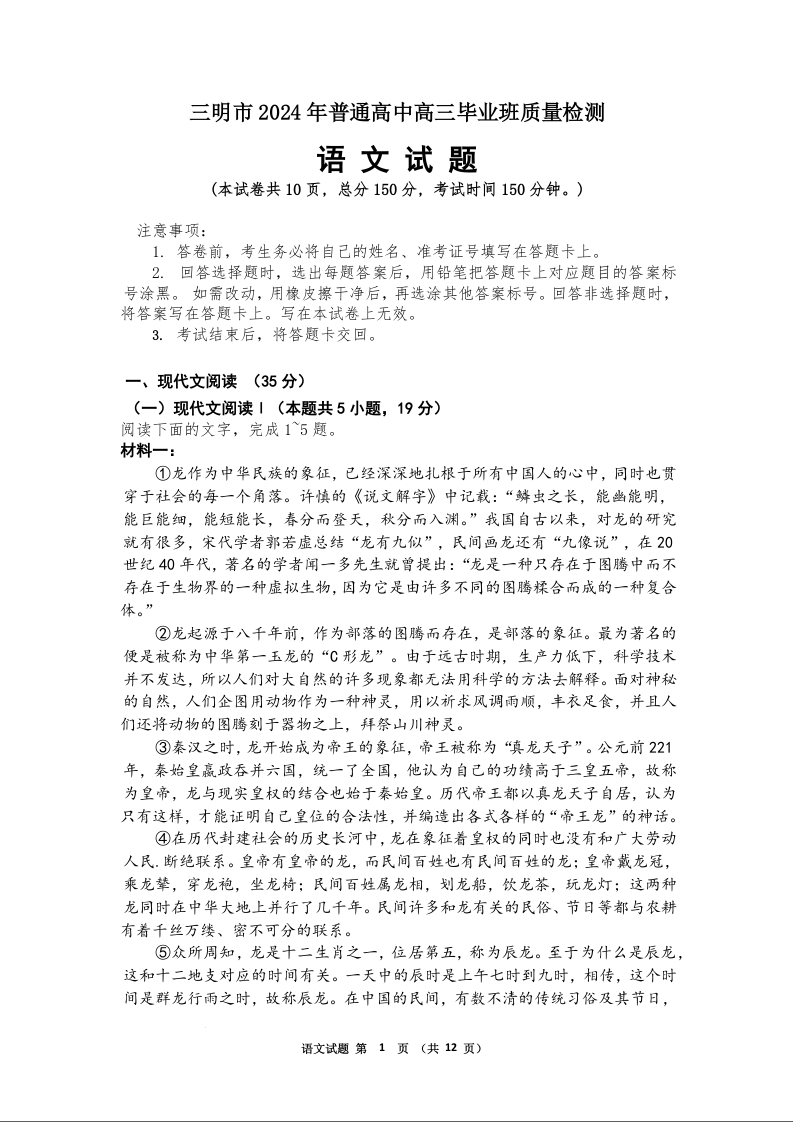 福建省三明市2024届高三下学期三模语文+答案