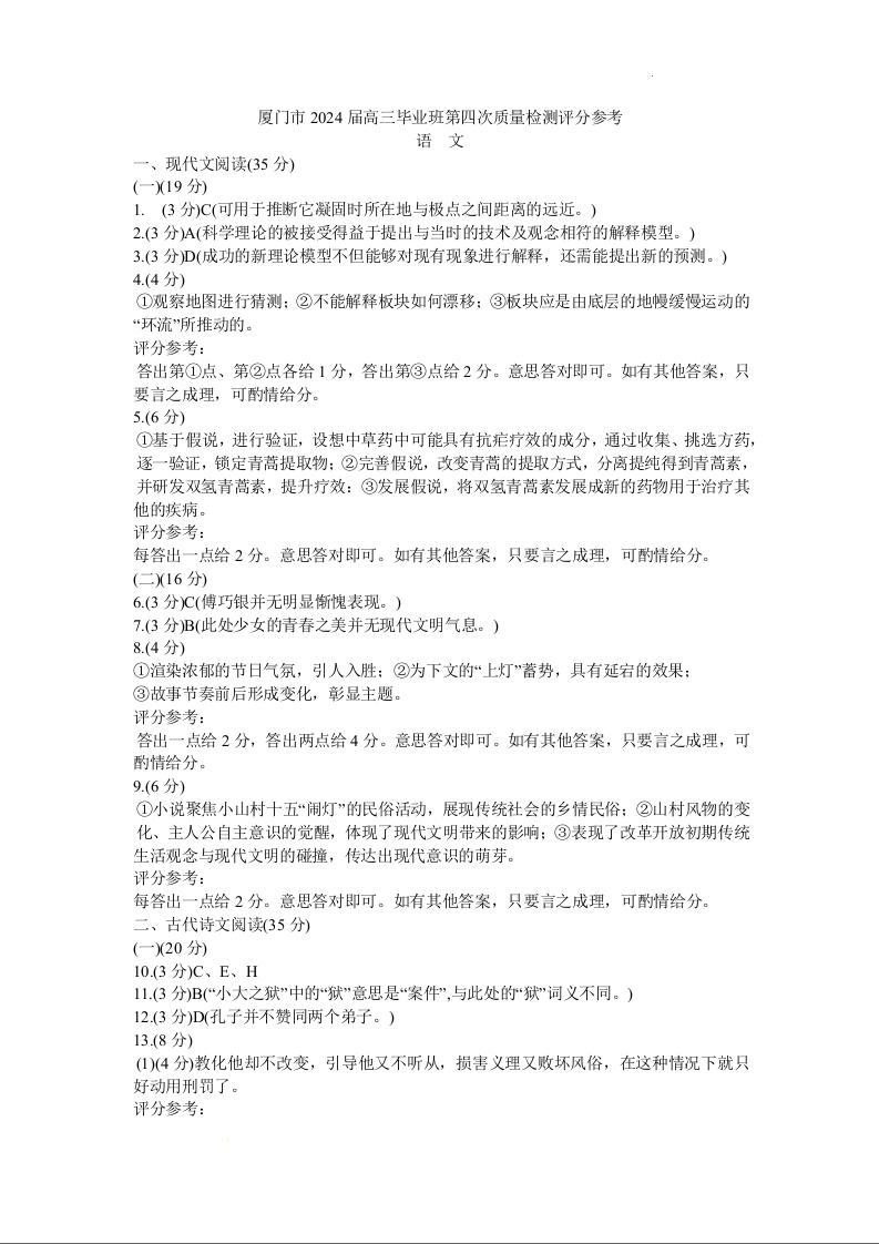 福建省厦门市2024届高三下学期联考模拟预测语文答案