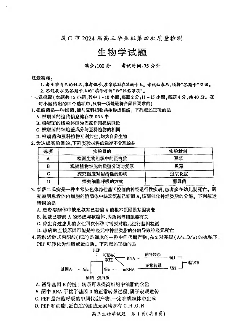 福建省厦门市2024届高三下学期联考模拟预测生物+答案
