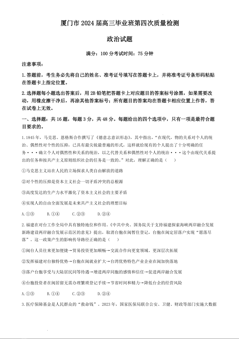 福建省厦门市2024届高三下学期联考模拟预测政治+答案