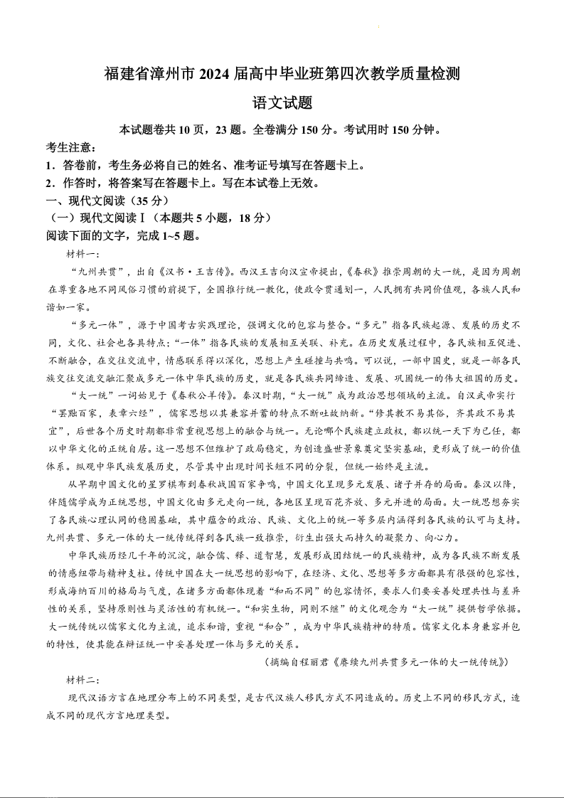 福建省漳州市2024届高三第四次教学质量检测语文