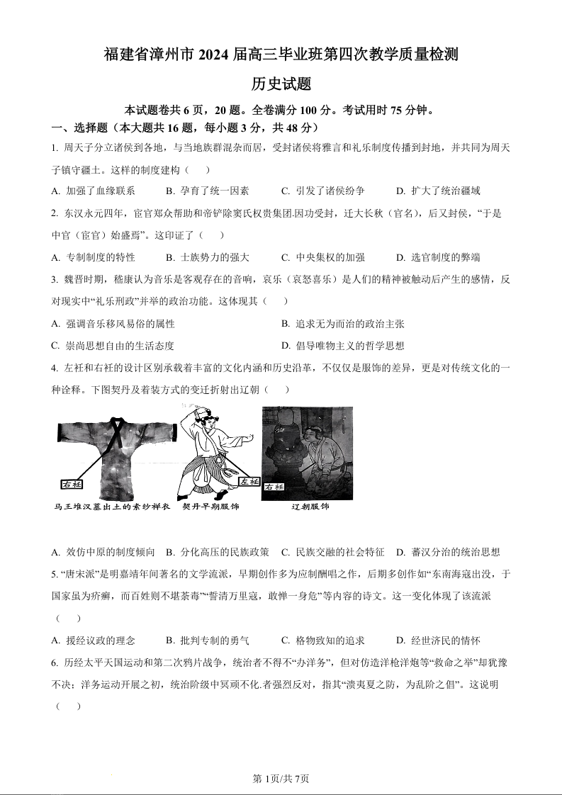 福建省漳州市2024届高三第四次教学质量检测历史(原卷版)