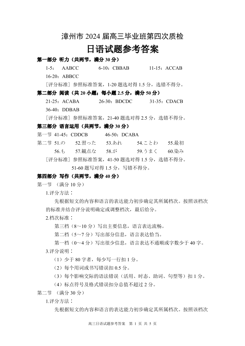 福建省漳州市2024届高三第四次教学质量检测日语答案