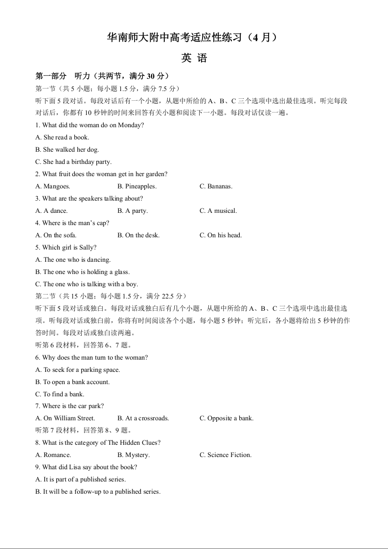 广东省华南师范大学附属中学2024届高三4月高考适应性练习英语+答案