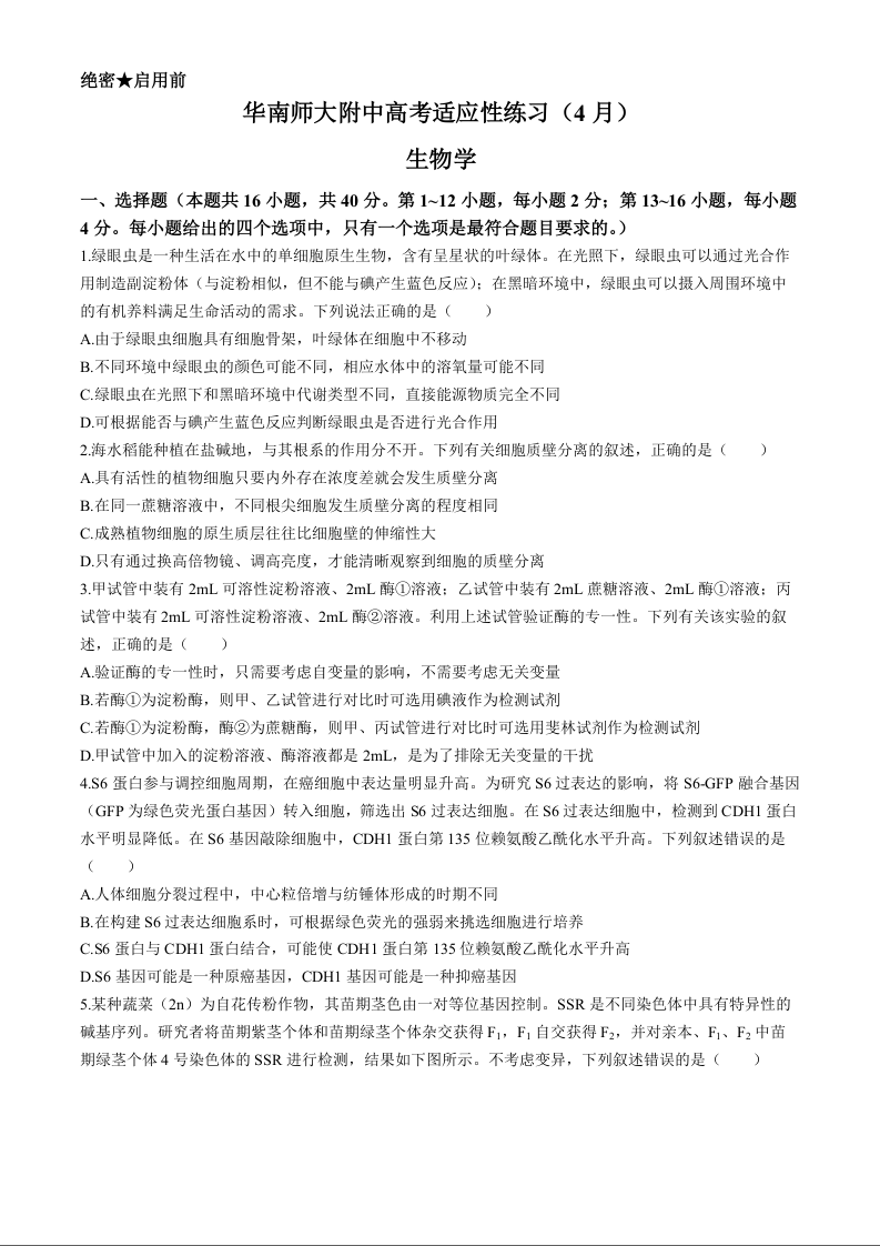 广东省华南师范大学附属中学2024届高三4月高考适应性练习生物+答案