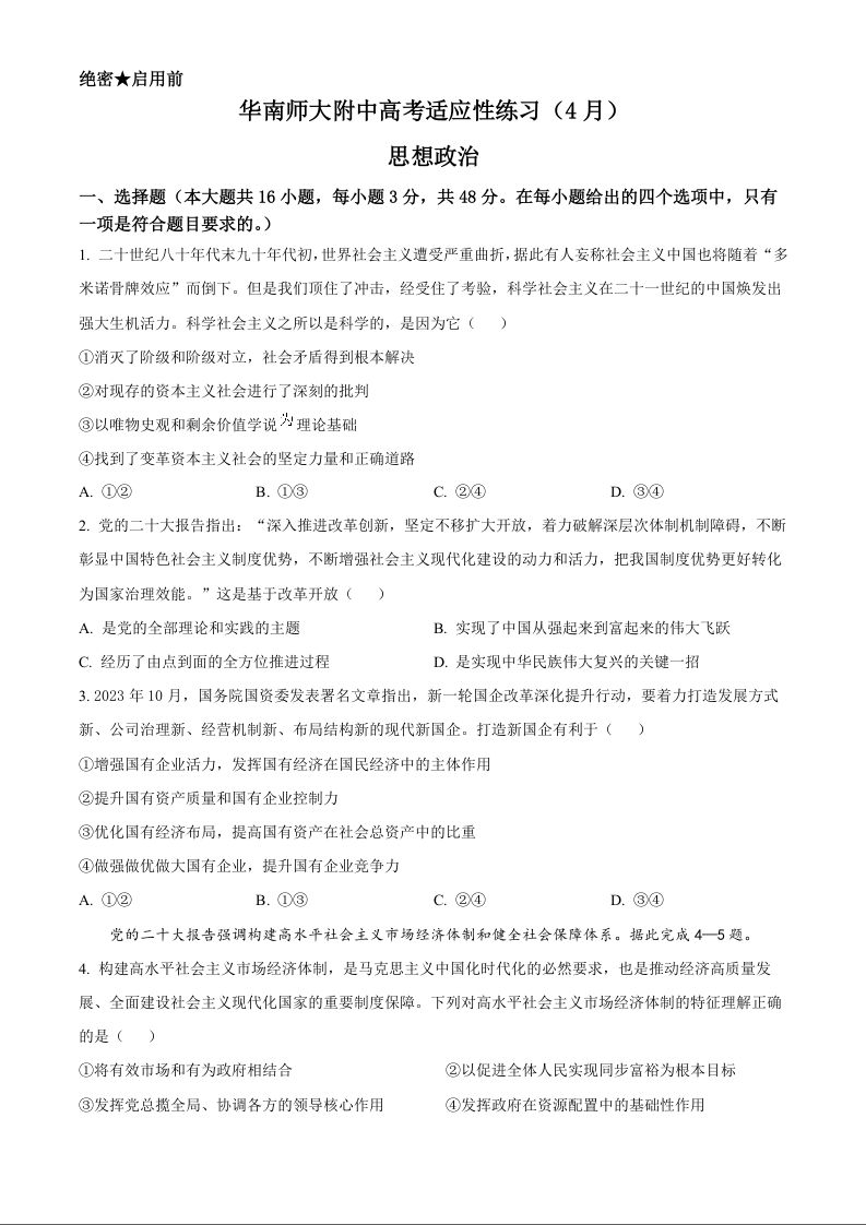 广东省华南师范大学附属中学2024届高三4月高考适应性练习政治+答案