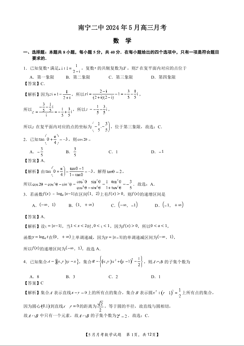 广西南宁市第二中学2024届高三下学期5月月考数学答案