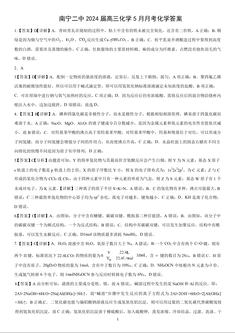 广西南宁市第二中学2024届高三下学期5月月考化学答案
