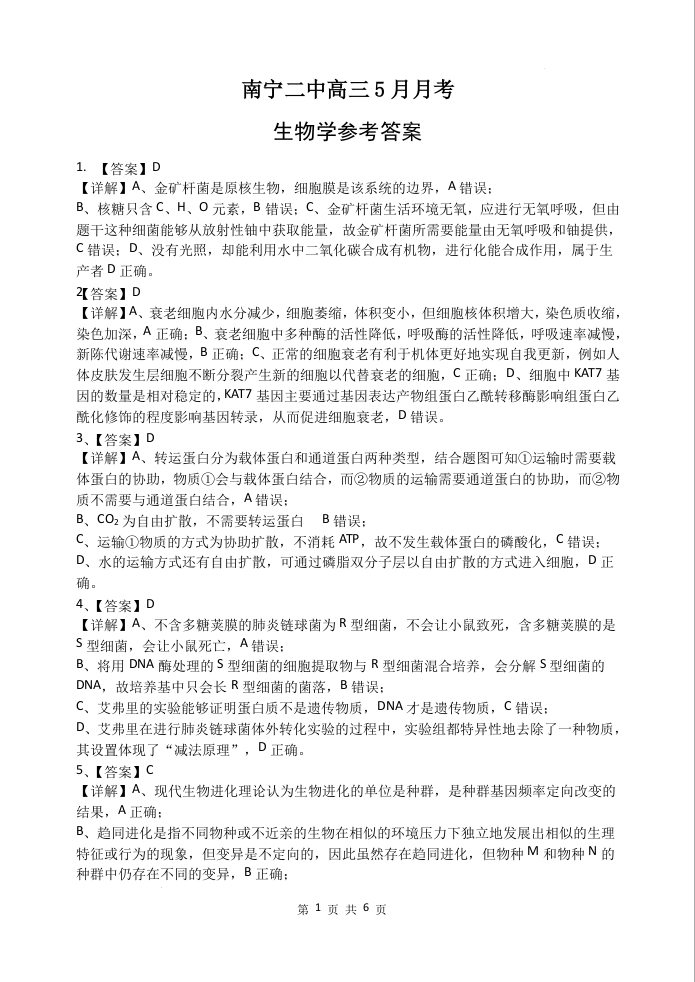 广西南宁市第二中学2024届高三下学期5月月考生物答案
