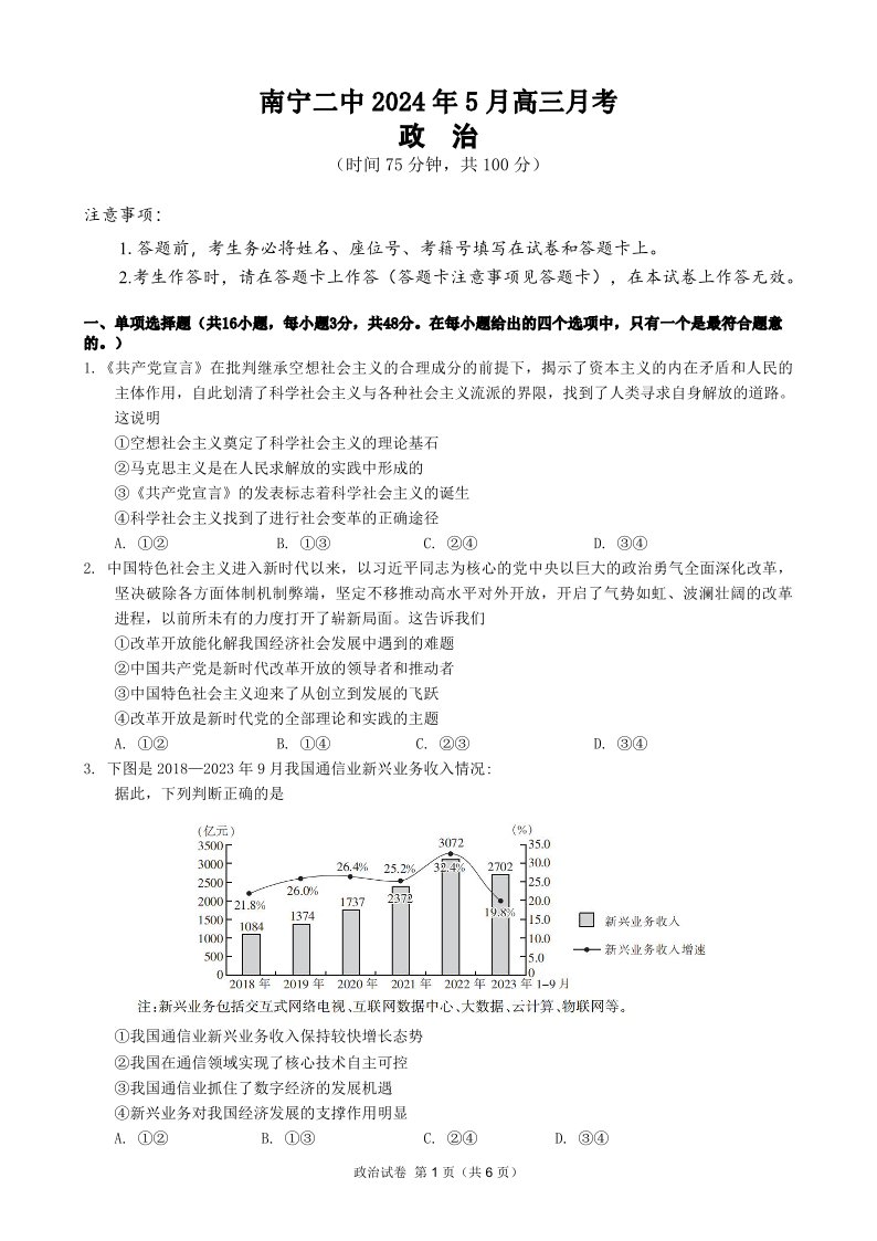 广西南宁市第二中学2024届高三下学期5月月考政治