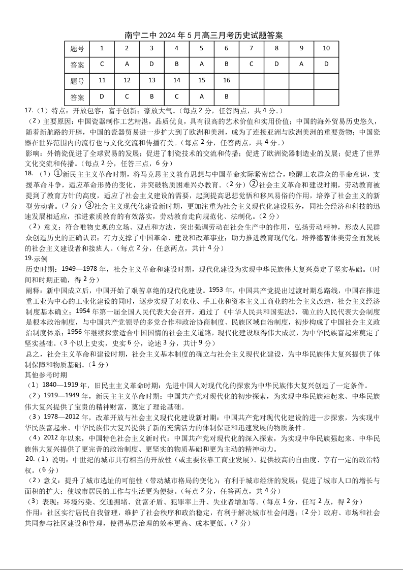 广西南宁市第二中学2024届高三下学期5月月考历史答案