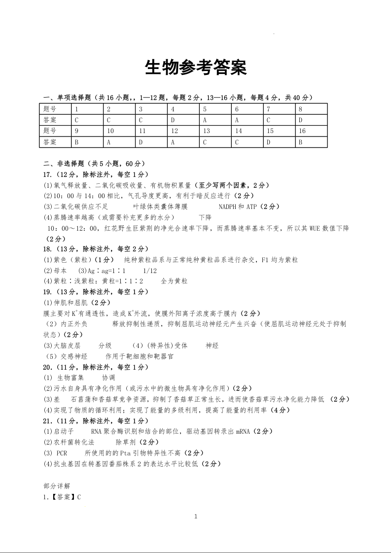 广西省2024届高三5月仿真考生物答案