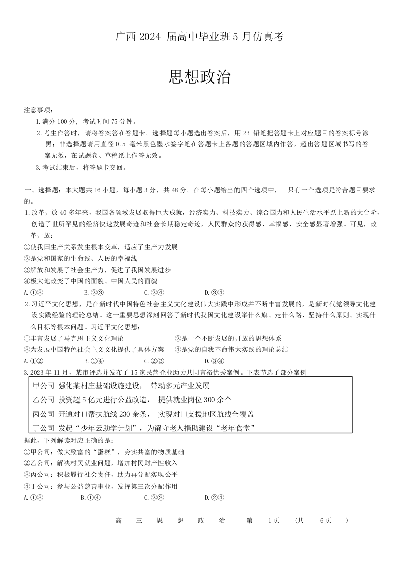 广西省2024届高三5月仿真考政治