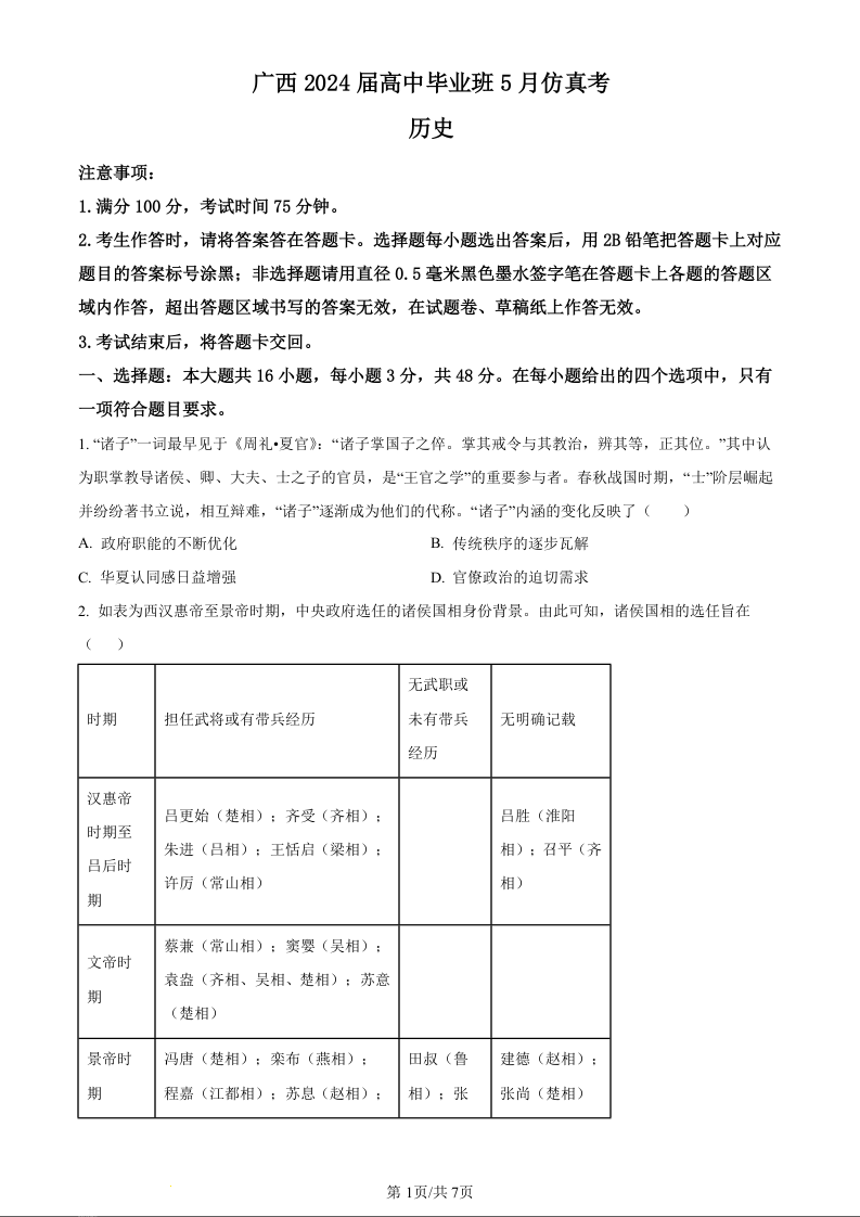 广西省2024届高三5月仿真考历史(原卷版)