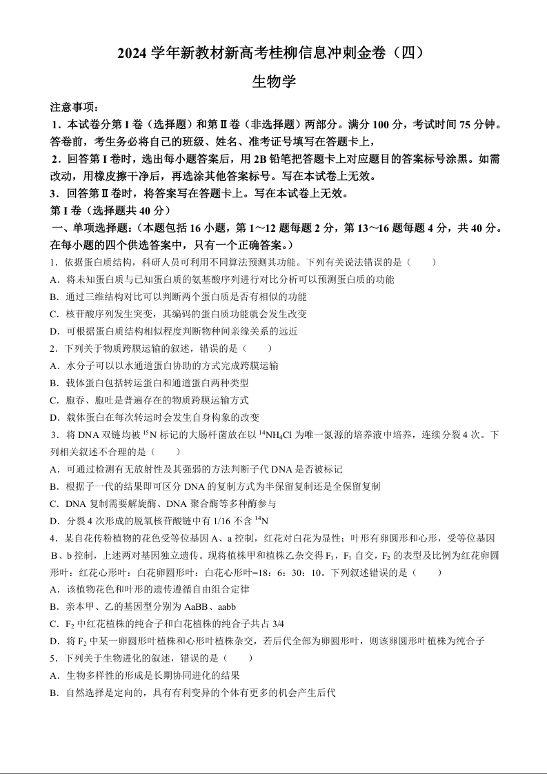 广西省2024届高三下学期新教材新高考桂柳信息冲刺金卷(四)生物+答案