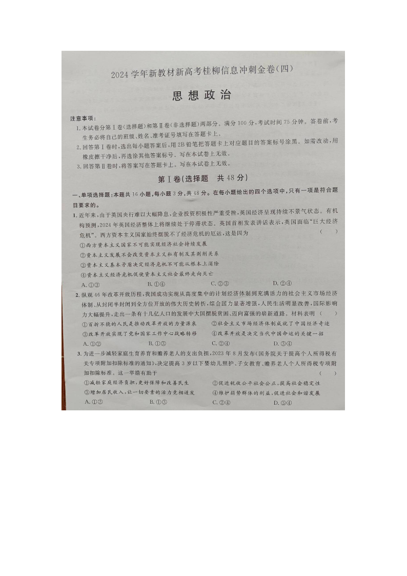广西省2024届高三下学期新教材新高考桂柳信息冲刺金卷(四)政治+答案