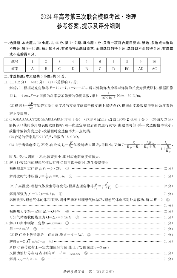 广西省桂林、来宾、北海2024届高三三模物理答案