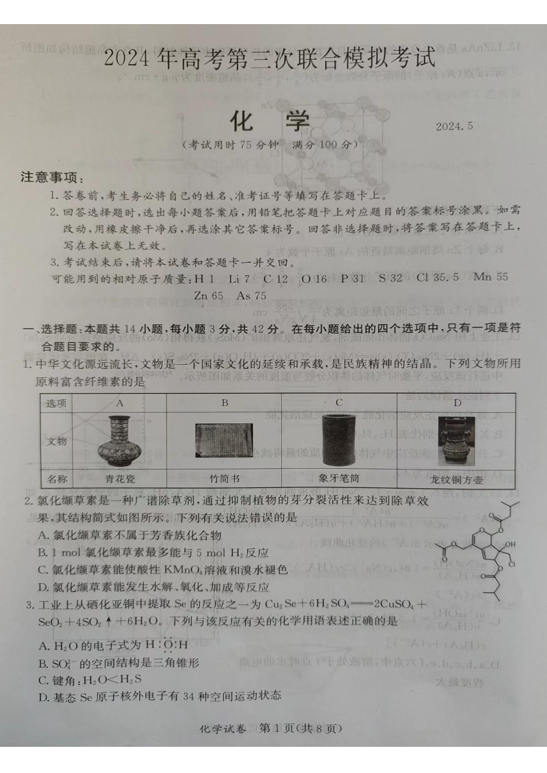 广西省桂林、来宾、北海2024届高三三模化学