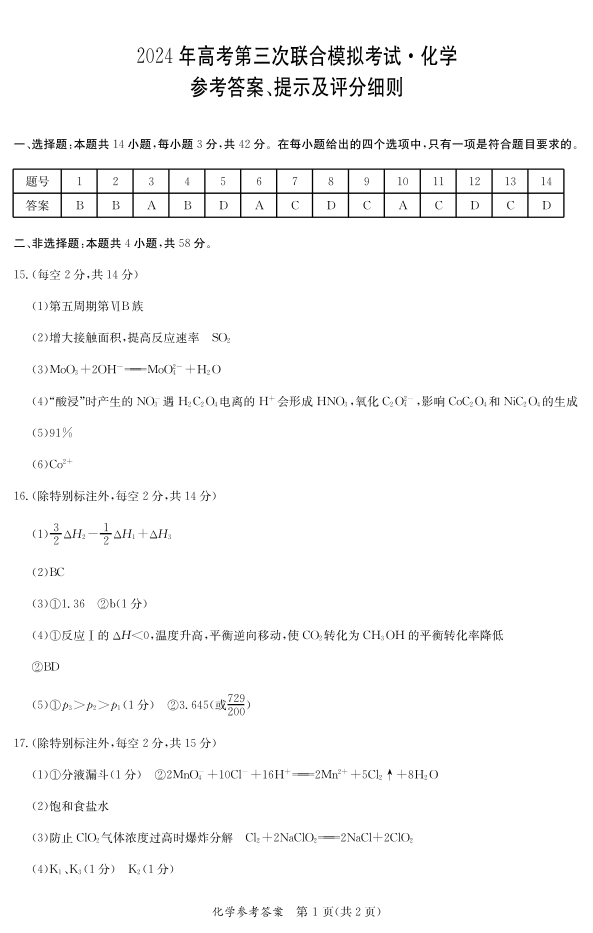 广西省桂林、来宾、北海2024届高三三模化学答案