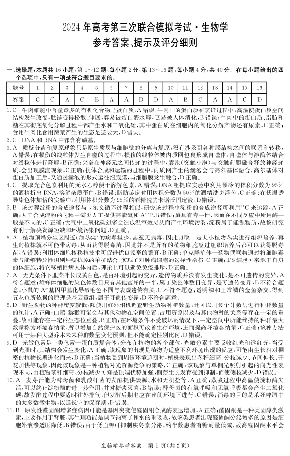广西省桂林、来宾、北海2024届高三三模生物答案