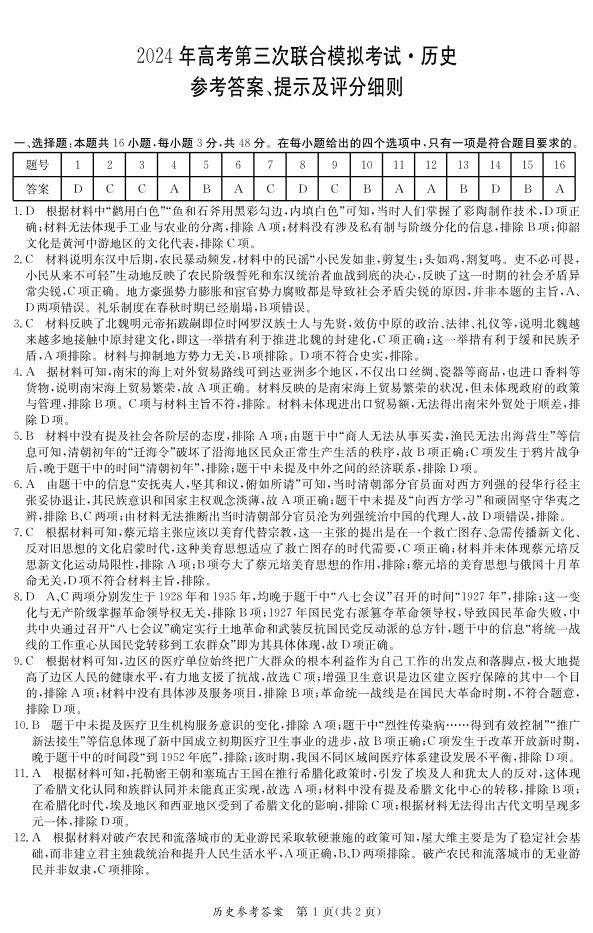 广西省桂林、来宾、北海2024届高三三模历史答案