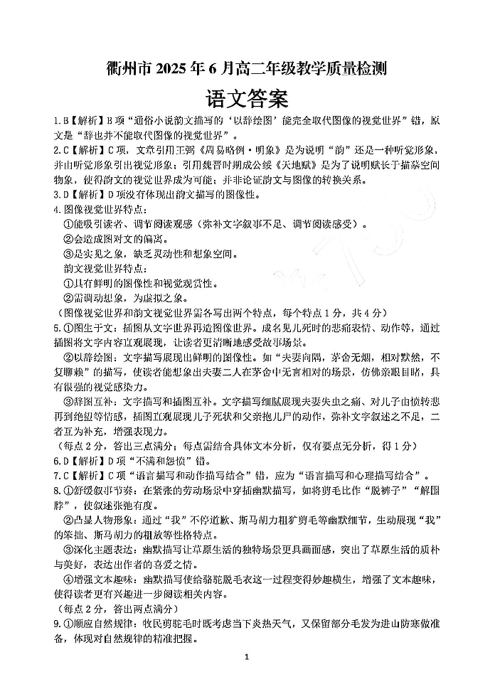 浙江省衢州市2024-2025学年下学期6月高二教学质量检测语文答案