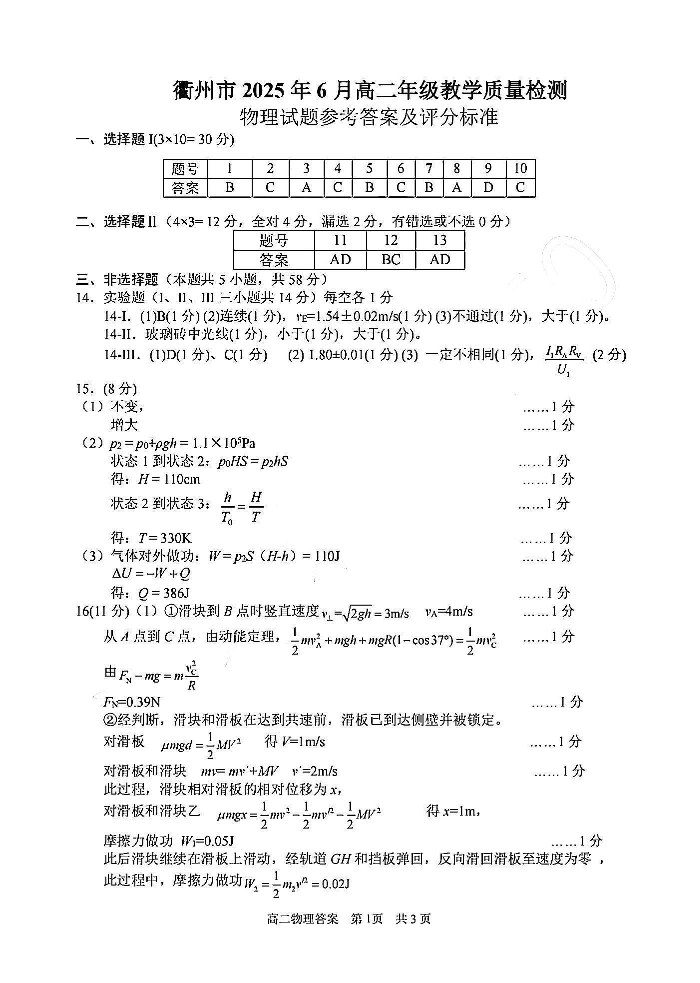 浙江省衢州市2024-2025学年下学期6月高二教学质量检测物理答案