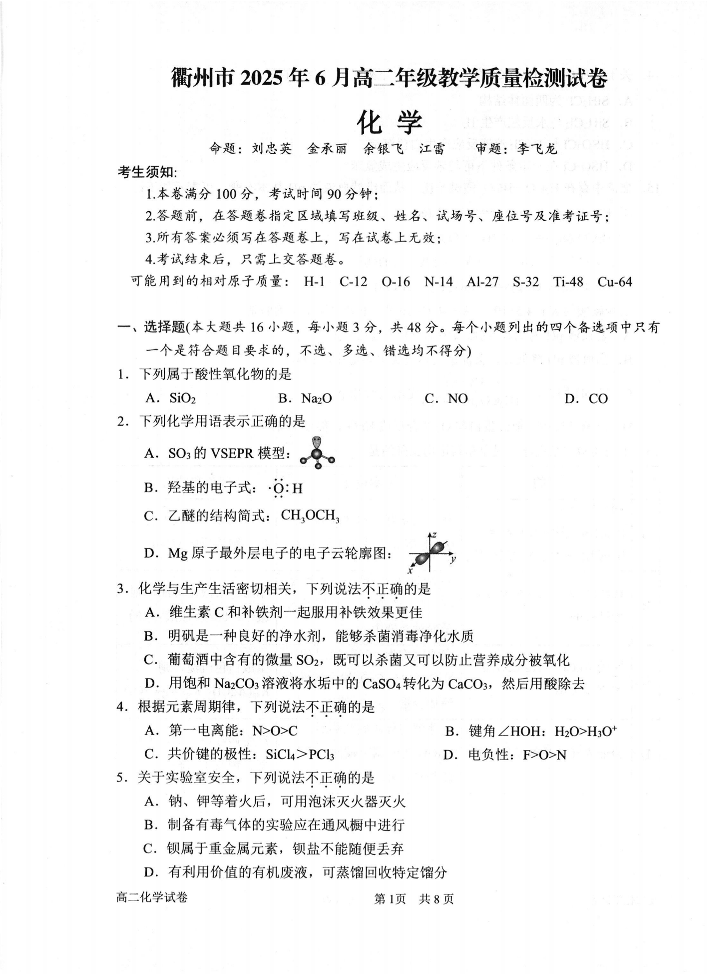 浙江省衢州市2024-2025学年下学期6月高二教学质量检测化学