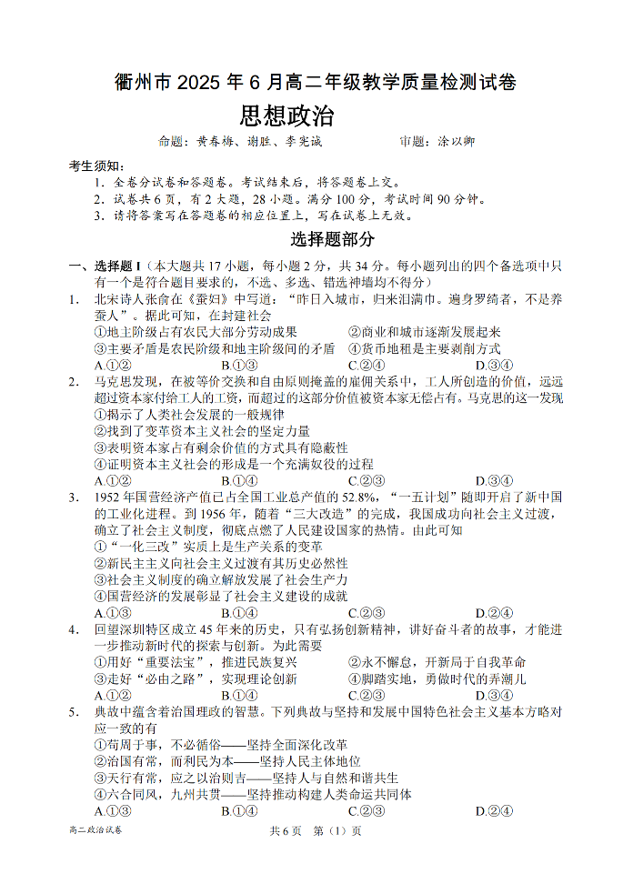 浙江省衢州市2024-2025学年下学期6月高二教学质量检测政治