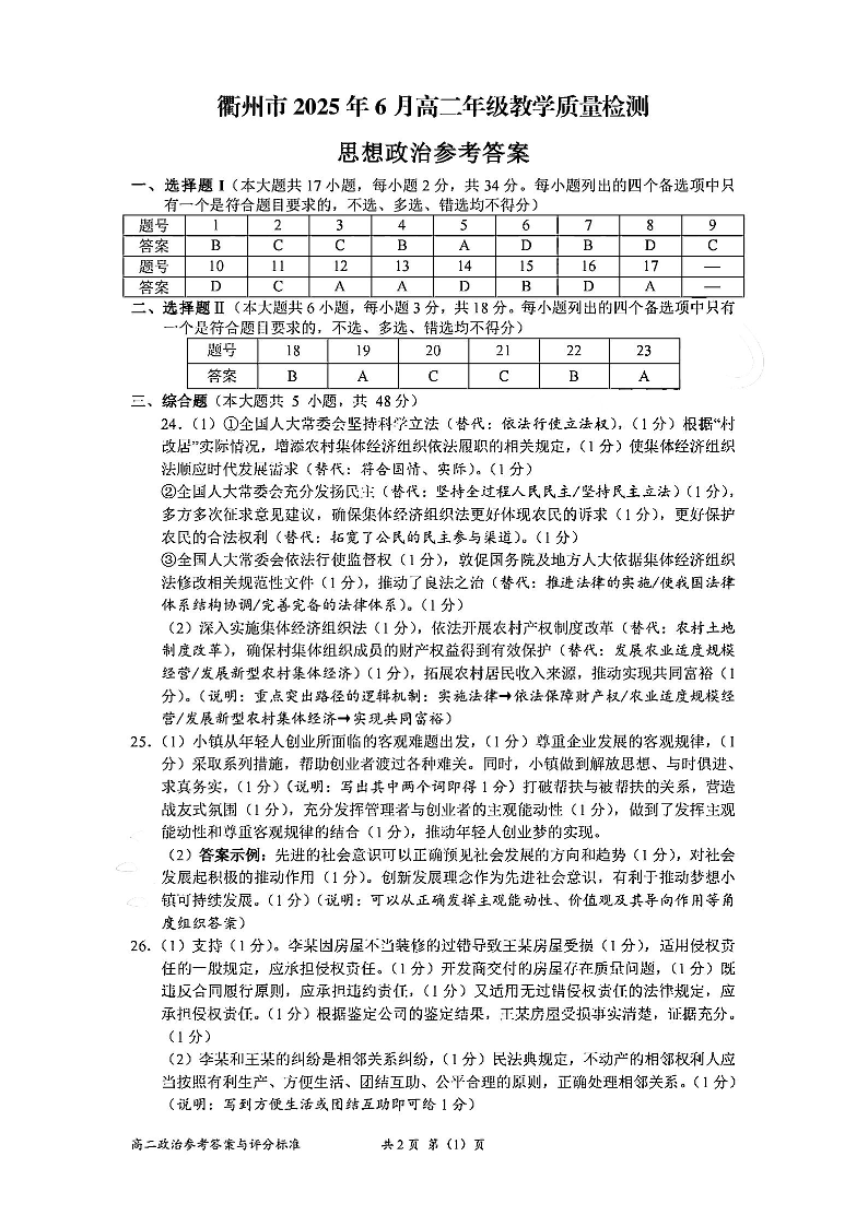 浙江省衢州市2024-2025学年下学期6月高二教学质量检测政治答案