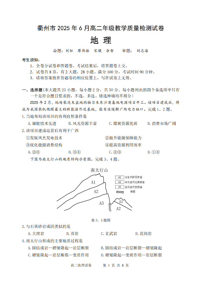 浙江省衢州市2024-2025学年下学期6月高二教学质量检测地理