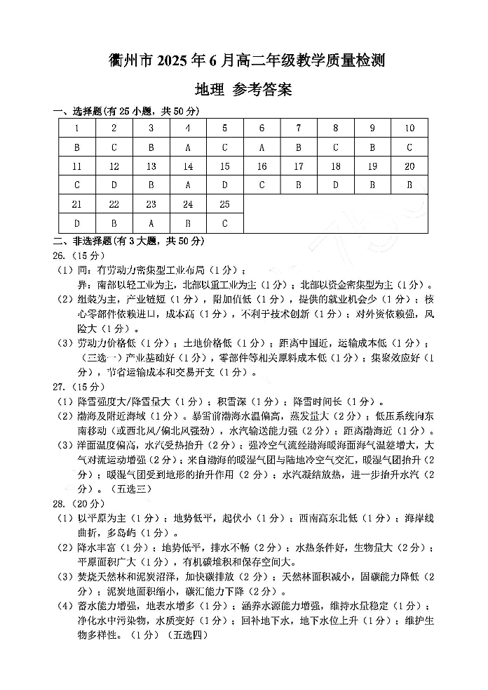 浙江省衢州市2024-2025学年下学期6月高二教学质量检测地理答案
