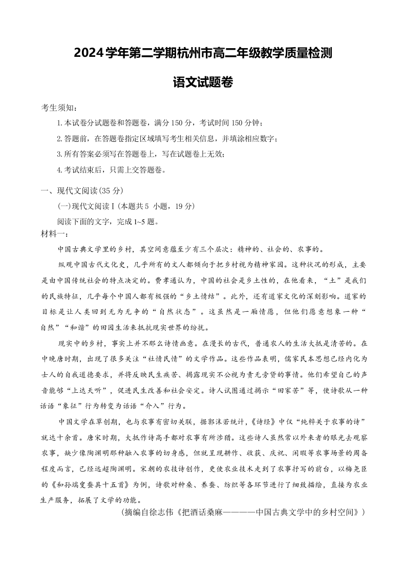 浙江省杭州市2024-2025学年下学期6月高二期末教学质量检测语文