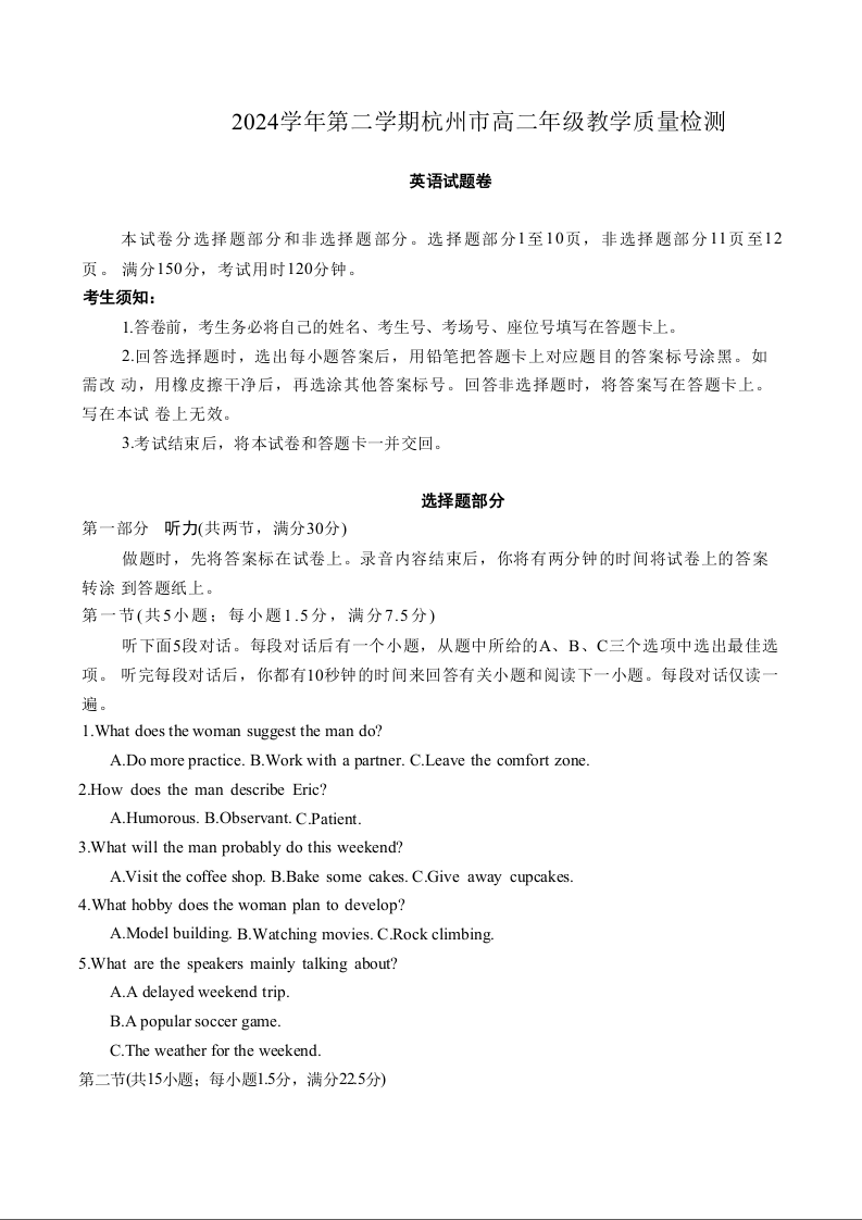 浙江省杭州市2024-2025学年下学期6月高二期末教学质量检测英语