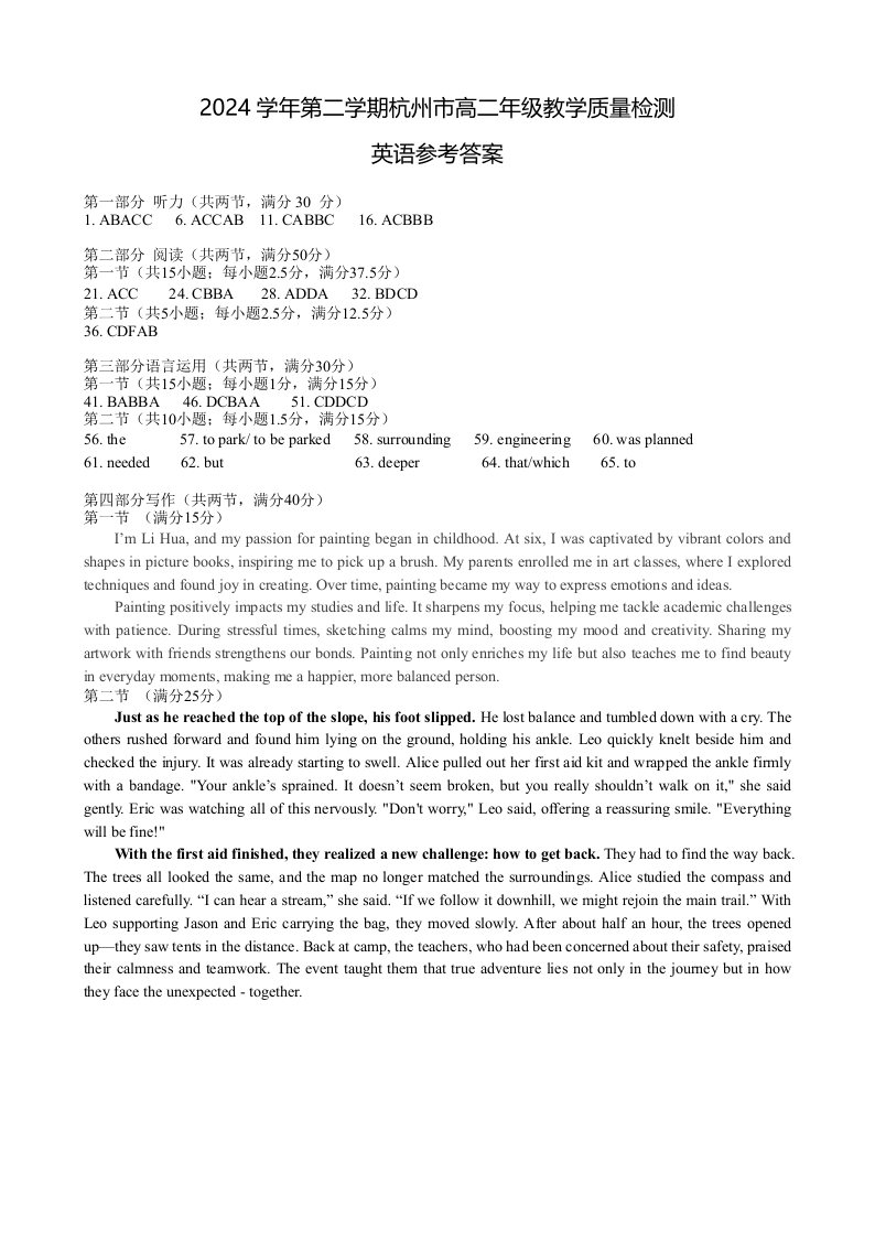 浙江省杭州市2024-2025学年下学期6月高二期末教学质量检测英语答案