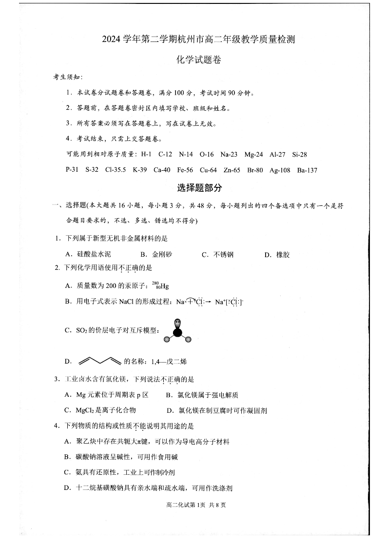 浙江省杭州市2024-2025学年下学期6月高二期末教学质量检测化学+答案